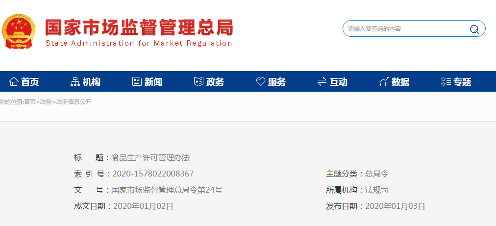《食品生產許可管理辦法》已于2019年12月23日經國家市場監督管理總局2019年第18次局務會議審議通過,現予公布,自2020年3月1日起施行。