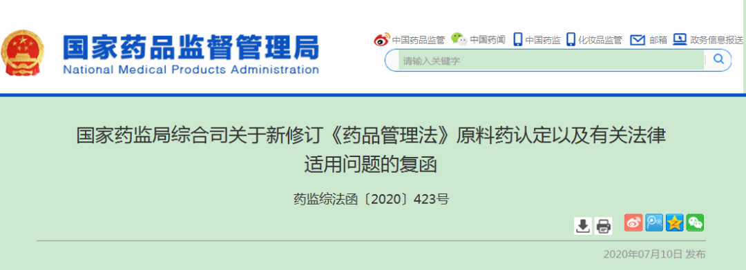 國家藥監局綜合司關于新修訂《藥品管理法》原料藥認定以