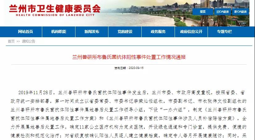2019年11月28日,蘭(lan)州獸研(yan)所(suo)布魯(lu)(lu)氏(shi)(shi)菌(jun)(jun)抗(kang)體陽(yang)(yang)性(xing)事件(jian)(jian)發(fa)生后(hou)(hou),蘭(lan)州市委、市政府高(gao)度重視(shi),按照省(sheng)(sheng)委、省(sheng)(sheng)政府統一(yi)安排部署,第一(yi)時間(jian)成立(li)(li)以省(sheng)(sheng)委常(chang)委、市委書記(ji)李榮(rong)燦任組(zu)(zu)(zu)長,市委副書記(ji)、市長張偉文(wen)任副組(zu)(zu)(zu)長的蘭(lan)州獸研(yan)所(suo)布魯(lu)(lu)氏(shi)(shi)菌(jun)(jun)抗(kang)體陽(yang)(yang)性(xing)事件(jian)(jian)屬地善后(hou)(hou)處置工(gong)(gong)(gong)作(zuo)領導小組(zu)(zu)(zu),下設“一(yi)辦六組(zu)(zu)(zu)”,制(zhi)定(ding)《蘭(lan)州獸研(yan)所(suo)布魯(lu)(lu)氏(shi)(shi)菌(jun)(jun)抗(kang)體陽(yang)(yang)性(xing)事件(jian)(jian)屬地善后(hou)(hou)處置工(gong)(gong)(gong)作(zuo)方(fang)案》和《蘭(lan)州獸研(yan)所(suo)布魯(lu)(lu)氏(shi)(shi)菌(jun)(jun)抗(kang)體陽(yang)(yang)性(xing)事件(jian)(jian)涉(she)及人(ren)員補償(chang)(chang)賠償(chang)(chang)方(fang)案》,全(quan)力開展屬地善后(hou)(hou)處置工(gong)(gong)(gong)作(zuo)。確定(ding)11家公立(li)(li)醫(yi)療(liao)機構為定(ding)點醫(yi)院,開設綠色通(tong)道和專門診室,提供免費、便捷的健(jian)康檢測(ce)和規范化(hua)治療(liao);對(dui)省(sheng)(sheng)級復核確認陽(yang)(yang)性(xing)人(ren)員逐人(ren)建立(li)(li)健(jian)康檔案,確定(ding)專人(ren)每(mei)月開展健(jian)康隨訪;同時,采取專家現場輔導、網上咨詢、熱線電話(hua)、發(fa)放宣傳冊等方(fang)式組(zu)(zu)(zu)織開展專業、科(ke)學的科(ke)普宣傳和答疑(yi)解惑。